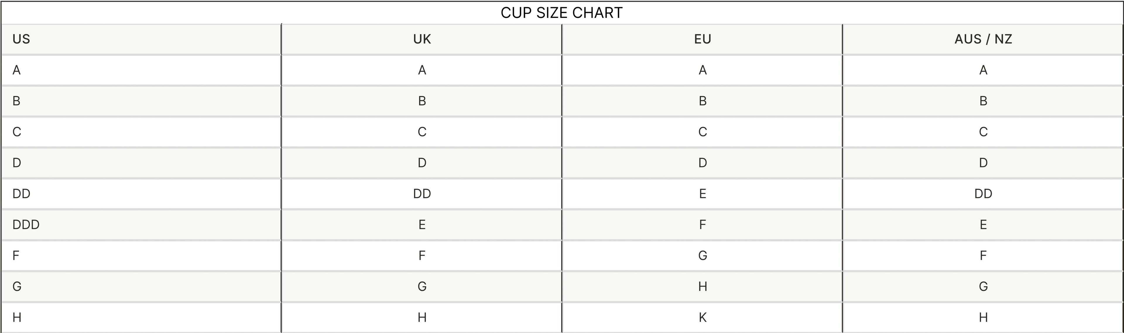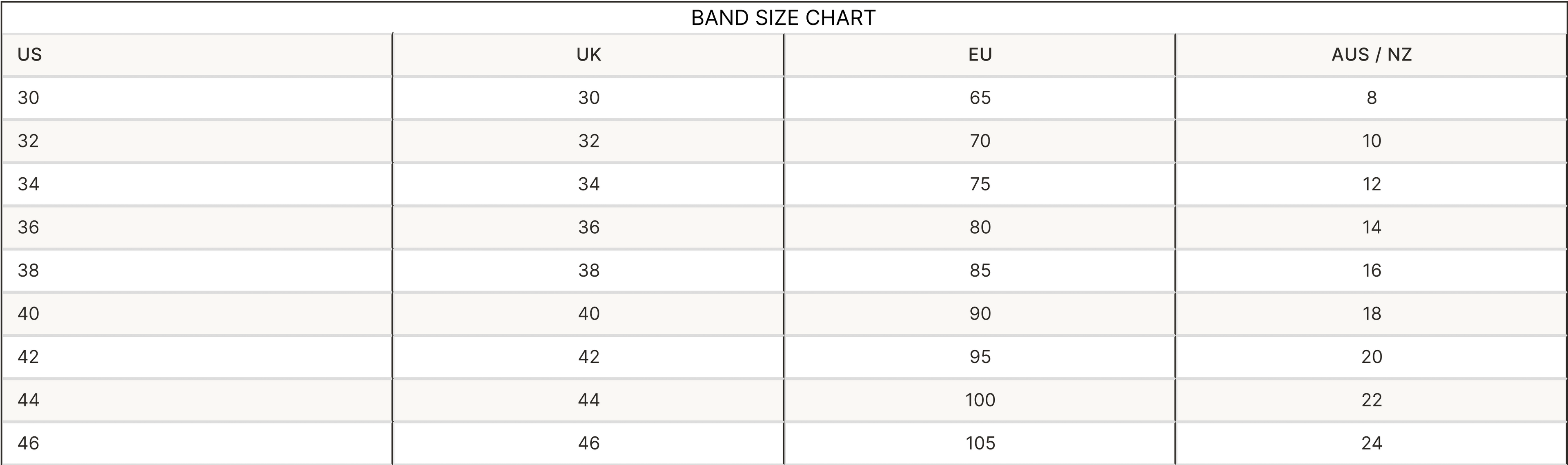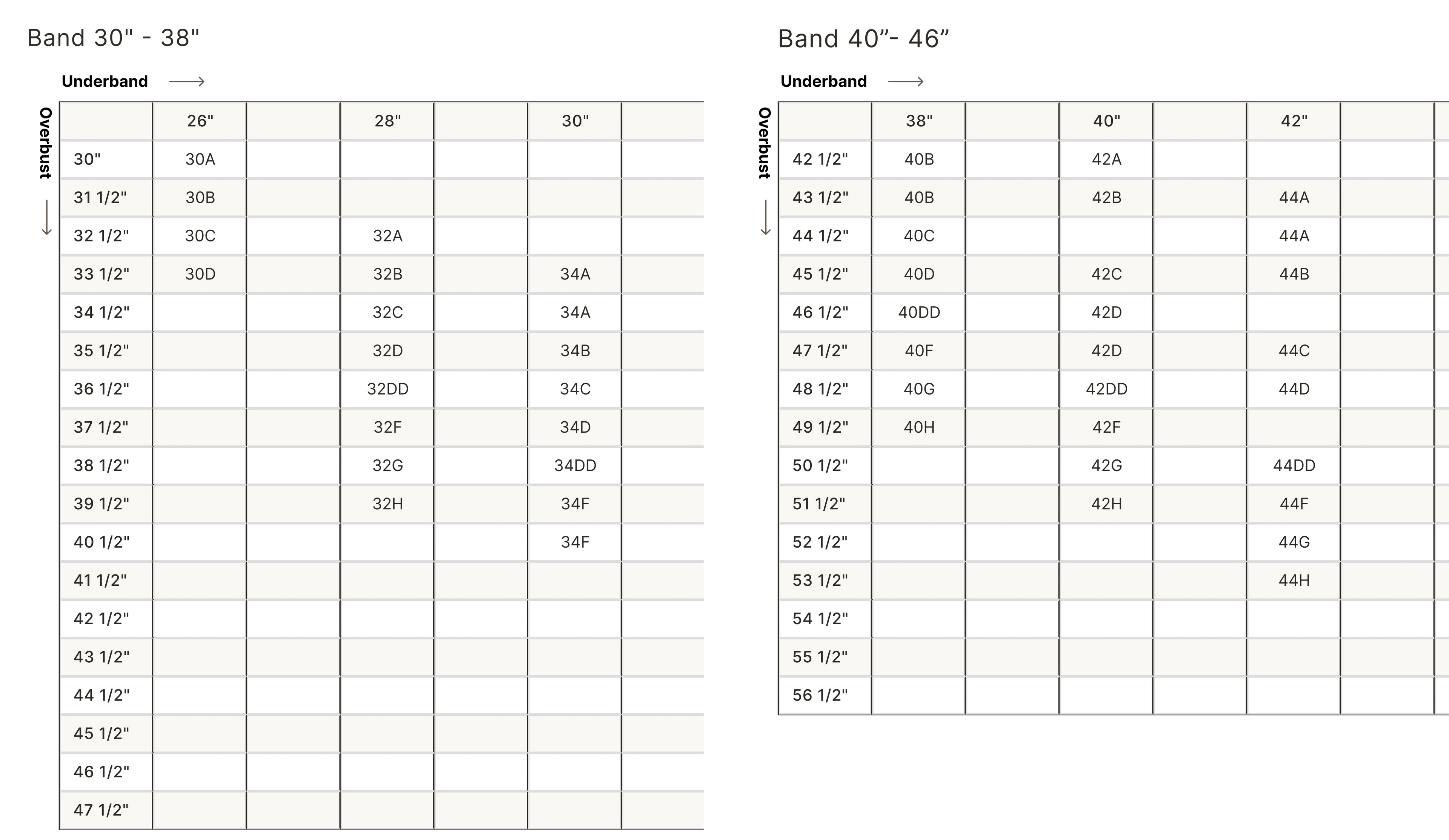 Get sizing for underwire bra styles that are available in band & cup sizes 30A to 46H. If you’re between sizes, size up or down to wearer's preference.