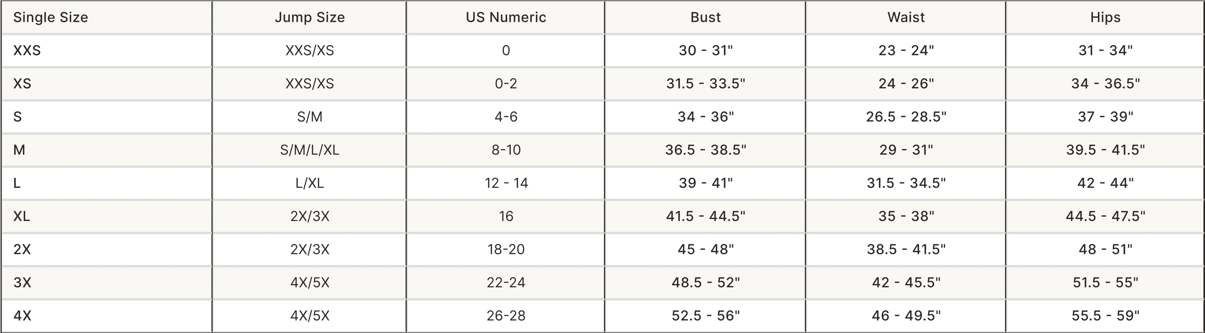 Sizing for all shapewear styles, including those that are available in jump sizes from XXS/XS to 4X/5X, and single sizes XXS to 4X.